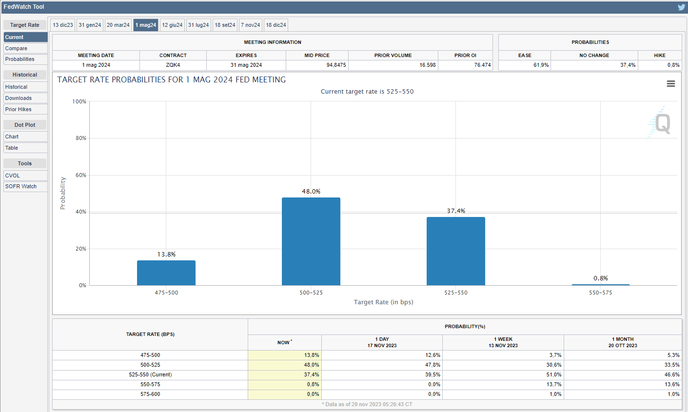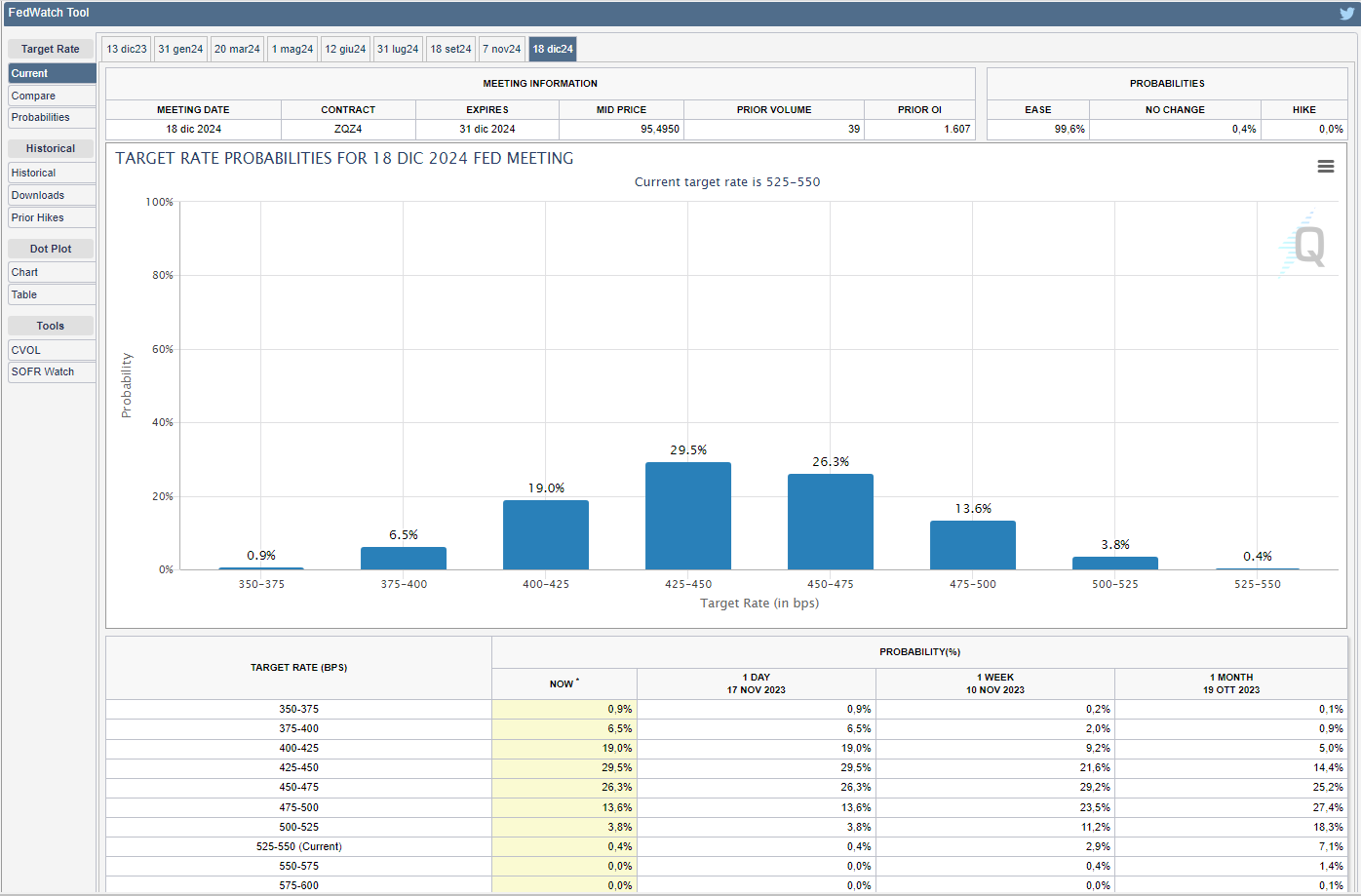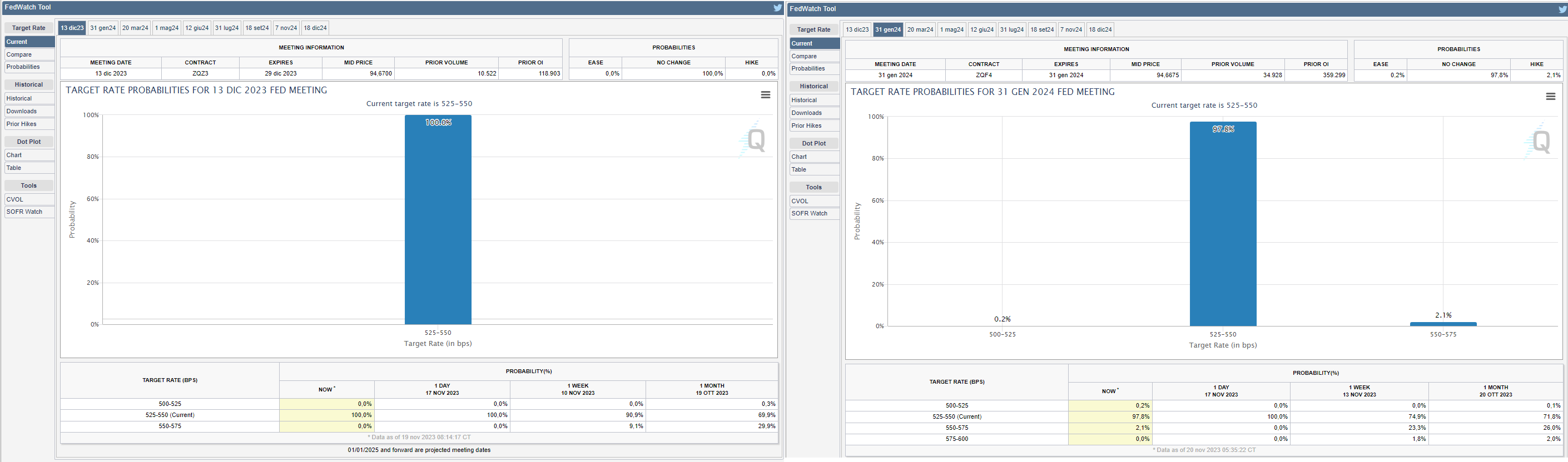Passiamo ora a vedere come il mercato prezza le probabilità dei Future sui Fed Funds. Gli investitori scontano al 100,0% tassi fermi al 5,25/5,50% per la prossima riunione del FOMC del 13 dicembre ed anche del 31 gennaio 2024 (v. grafico):