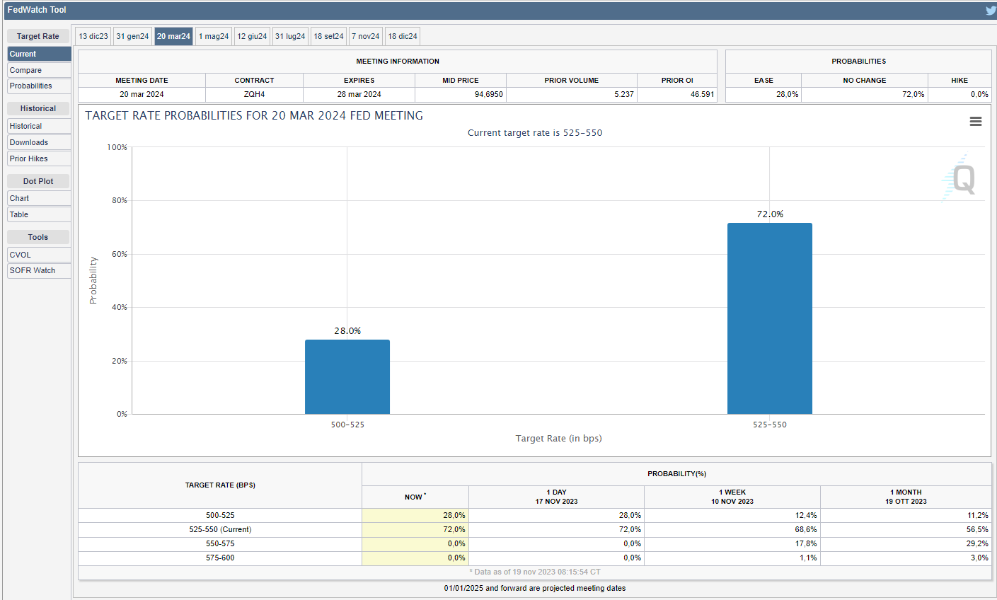 Mentre prende quota la percentuale per un primo taglio dei tassi nella riunione del 20 marzo 2024, con una probabilità del 28% (v. grafico):