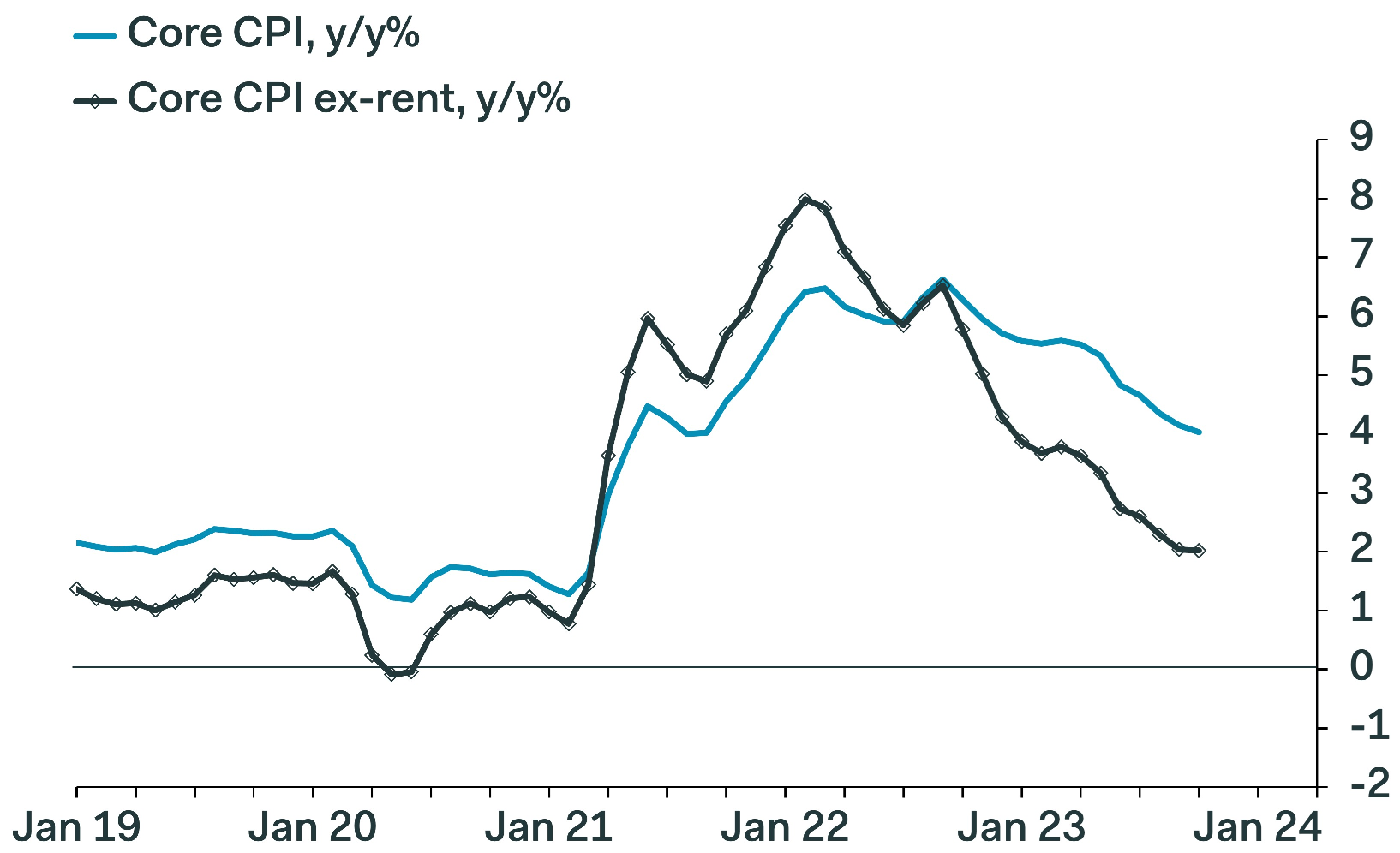 In un paio di settimane si è passati dal dipingere il prossimo futuro dell’economia statunitense da resiliente a “soft landing” o ad atterraggio morbido, grazie ad una serie di dati macroeconomici sul mercato del lavoro e sull’inflazione, in discesa. I dati della scorsa settimana sui nuovi occupati in calo e quelli della disoccupazione totale in salita, sono stati corroborati da quelli di questa settimana che segnalano una discesa del dato sui CPI sia in modalità ‘headline’ che ‘core’ con il petrolio in forte calo (minimi di luglio scorso) che conferma il trend ribassista dell’inflazione, con il dato PPI anch’esso in sorprendente calo e solo le vendite al dettaglio hanno mostrato un calo meno marcato rispetto alle attese ma proveniente da uno spumeggiante + 0,9% di settembre. Questa cosa lascia intendere che l'inflazione scende senza richiedere un rallentamento marcato dell'economia (appunto uno scenario ‘soft landing’). A ciò aggiungiamo pure che, almeno parte della resilienza dei consumi sembra venire dal fatto, ormai noto, che il CPI USA effettivamente "pagato" dai consumatori è più basso in quanto la componente OER (la stima del costo degli alloggi nel CPI) non è effettivamente un costo né per i proprietari di casa, né per gli affittuari sotto contratto, se non quando scadono i contratti, pertanto i dati attuali sono ritardati rispetto alla dinamica vera degli affitti (che scendono da un bel po'). Questa componente fittizia e ritardata pesa per quasi la metà del dato ‘core’ attuale, come ben mostra il seguente grafico:
