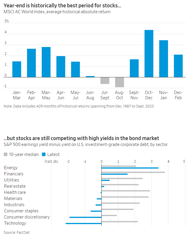 L’ inafferrabile “atterraggio morbido” che molti economisti ritenevano impossibile ora sembra il risultato più probabile e ci sono buone ragioni per sperare in maggiori guadagni. La Federal Reserve ha probabilmente annunciato a luglio scorso il suo ultimo aumento dei tassi di interesse, che storicamente ha quasi sempre portato a un calo dei rendimenti dei titoli del Tesoro a 10 anni nei successivi 12 mesi, ma il mercato obbligazionario lo sta già anticipando. Inoltre, le azioni tendono ad andare bene nell’ultimo trimestre dell’anno. Secondo Ned Davis Research, a partire dal 1987 l’indice MSCI All Country World ha avuto un rendimento totale medio del 4,4% tra ottobre e dicembre, rendendolo il miglior periodo di tre mesi in cui investire. Alcune prove indicano un “rally di Babbo Natale” durante le vacanze. Ciò potrebbe essere guidato da singoli investitori intrisi di spirito festivo o, forse più realisticamente, dall’anticipazione che i gestori finanziari professionisti torneranno ai loro posti a gennaio pronti a distribuire i loro budget di rischio per l’anno.