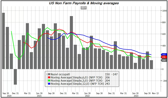 Anche le richieste di sussidi di disoccupazione settimanali sono cresciute e quelle continue sono sui massimi da fine 2021. E’ vero che queste serie sono volatili e la destagionalizzazione spesso fa brutti scherzi con gli scioperi che contribuiscono a gonfiarle ma, come detto, la serie sulle richieste continue è costante nel tempo e se aggiungiamo che le ore lavorate sono sui minimi pre-covid, allora il quadro dipinge un’economia in cui le aziende non licenziano in quanto hanno fatto tanta fatica ad assumere, ma richiedono sempre meno manodopera aggiuntiva. Che succederà se dovessero alla fine essere costretti a ridurrre? Ricordo che il principale serbatoio di lavoro USA è la piccola impresa, che non se la passa bene coi Fed Funds così alti. Pertanto, anche se in generale questi restano indicatori imperfetti, sono tanti e concordi. E sono coerenti con il trend di medio periodo dell'occupazione USA che è quello di una discesa, come si nota dal seguente grafico con le medie: