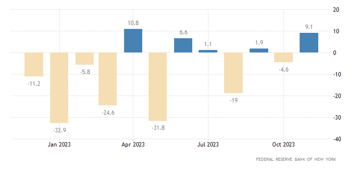 L’indice manifatturiero del New York Empire State fa un balzo dai -4,60 punti di ottobre ai 9,10 punti di novembre, ben oltre il consensus di -2,80 punti. Il dato è rilasciato dalla Federal Reserve Bank di New York.