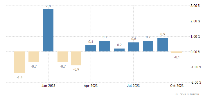 Le vendite al dettaglio nel mese di ottobre a livello mensile registrano un -0,1% (il segno ‘meno’ non si vedeva da marzo), contro un consensus del -0,3% e invertendo rotta rispetto al +0,9% di settembre (rivisto da +0,7%). Il dato è rilasciato dall’U.S. Census Bureau.