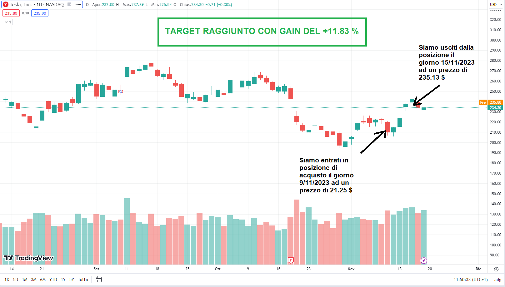 Abbiamo acquistato il titolo TESLA il giorno 09 novembre 2023 sul mercato borsistico NASDAQ di New York, al prezzo di 210,25 $ con la strategia Nasdaq Weekly del Portafoglio Storico. Dopo meno di una settimana ed esattamente il giorno 15 novembre 2023, il titolo è riuscito a toccare il nostro livello di target a 235,13 $ al quale abbiamo venduto guadagnando l’ennesimo ottimo + 11,83% !!