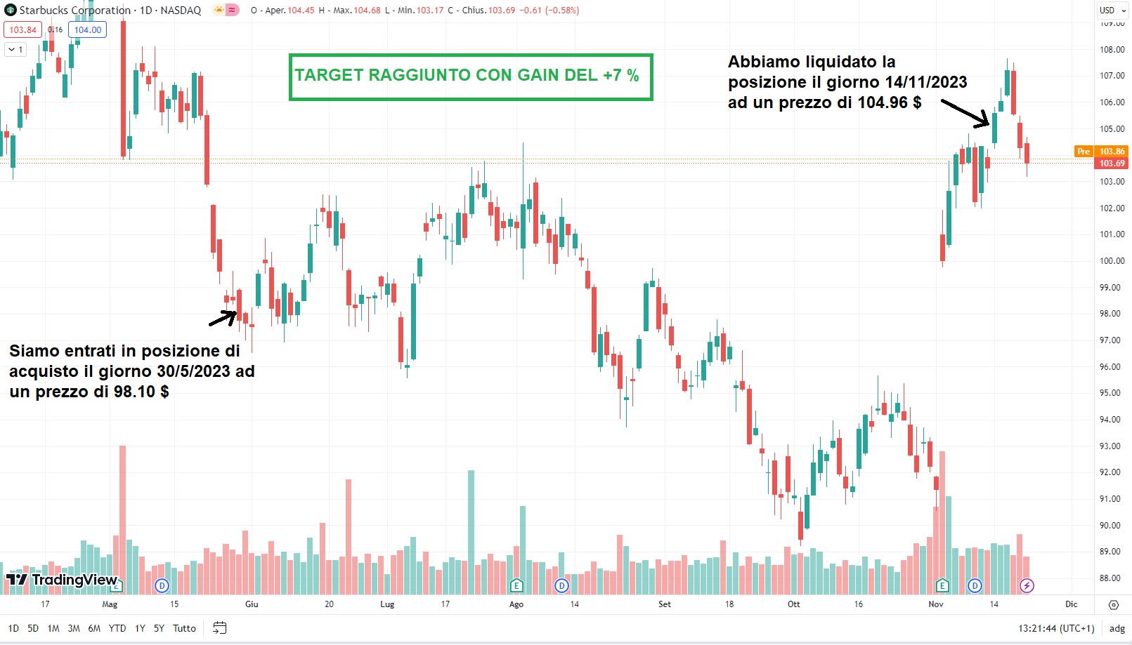 Il rally di fine anno è iniziato in quanto gli investitori non credono più alla retorica dei membri della FED su un ulteriore stretta sui tassi di interesse anzi, visti gli ultimi dati macro sull’inflazione in discesa pubblicati da poco, sicuramente siamo su un top e molto probabilmente nel 2024 si inizieranno a vedere dei tagli ai tassi a tutto vantaggio delle aziende, soprattutto quelle ad alta crescita. Le nostre strategie operative ci consentono di proseguire l’attività sia nelle fasi di debolezza dei mercati che in presenza di mercati con forza relativa in aumento, macinando target su target sui nostri Portafogli azionari. Ricordate che i nostri consigli operativi del LombardReport.com vi seguono ovunque, al lavoro o in ferie, basta un click per non farti perdere nessuna occasione di fare trading ma anche guadagnando. E veniamo ad una delle ultime operazioni vincenti dei giorni scorsi sul portafoglio Storico: Abbiamo acquistato il titolo STARBUCKS, simbolo: SBUX, codice Isin: US8552441094 il giorno 30 maggio 2023 sul mercato borsistico NASDAQ di New York, al prezzo di 98,10 $ con la strategia Nasdaq Weekly del Portafoglio Storico. Ad agosto il titolo era arrivato molto vicino al nostro livello di target ed un rovescio del mercato non ci ha consentito di venderlo. Ma la solidità della società certificata da ottimi bilanci alla fine ha avuto la meglio anche durante l’ottobre nero dei mercati azionari ed esattamente il giorno 15 novembre 2023, il titolo è riuscito a toccare il nostro livello di target a 104,96 $ al quale abbiamo venduto guadagnando l’ennesimo buon + 7,00% !! STARBUCKS, è una società che si occupa della produzione, commercializzazione e vendita al dettaglio di caffè speciali. Opera attraverso i seguenti segmenti: Nord America ed Internazionale, Sviluppo del canale e Aziendale e altro. Il segmento del Nord America si concentra sugli Stati Uniti e sul Canada. Il segmento internazionale è coinvolto in Cina, Giappone, Asia Pacifico, Europa, Medio Oriente, Africa, America Latina e Caraibi. Il segmento Channel Development comprende caffè tostati in grani e macinati, Seattle's Best Coffee e prodotti monodose a marchio Teavana. L'azienda è stata fondata da Jerry Baldwin e Howard D. Schultz il 4 novembre 1985 e ha sede a Seattle nello stato di Washington. Nel Portafoglio Storico sono presenti due strategie meccaniche dall’operatività molto tranquilla visto che si basano su un time frame settimanale ma, nel contempo, l’investimento è di breve durata. Una è riservata ad un’operatività su titoli azionari, italiani, europei e statunitensi, con un rendimento che varia dal 7 all’8%. L’altra è la famosa “Nasdaq Weekly” presente nel nostro Portafoglio da più di 7 anni che investe nei titoli facenti parte l’indice Nasdaq100 sempre in modalità settimanale, con una percentuale di operazioni a target che supera il 90% e con un rendimento del 7% ad operazione. Tutte e due le strategie sono facilmente replicabili anche da persone con poca esperienza o che si affacciano per la prima volta nel mondo della finanza. Di seguito l’equity line aggiornata al 3 novembre 2023: APPROFITTA DEL VENERDI' PIU' NERO DELL'ANNO CON UNA PROMOZIONE IMPERDIBILE ! Sottoscrivendo l'abbonamento bimestrale a LombardReport.com ti regaliamo 1 mese FREE ! La promozione scade: Giovedì 30 Novembre 2023 entro le h: 24.00 Approfittane ! |
