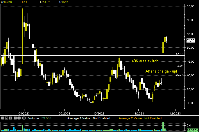 Anche in questo caso attenzione al gap up lasciato aperto ai 40$ e c'è da giurarci che tra i 43 e i 40$, una volta che sarà tornata la correzione dei prezzi al ribasso, ci sarà da assistere ad un bel movimento tecnico che può essere sfruttato nella singola giornata di trading e con stop loss a portata in caso di sorprese.