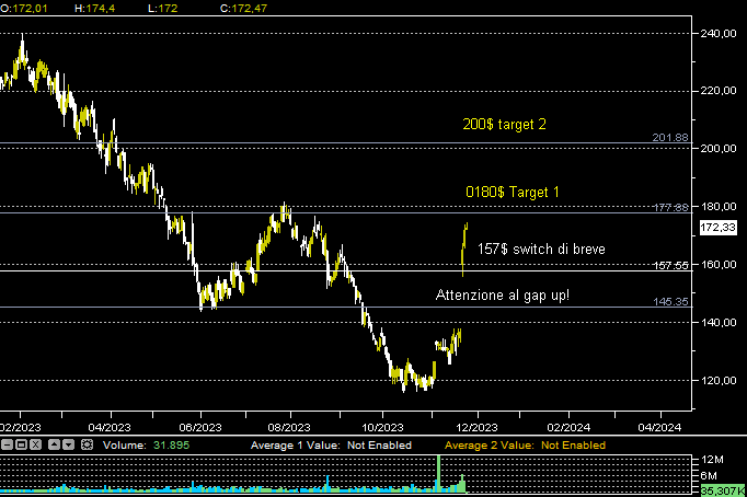 Innanzitutto il movimento effettuato sembra aver già avuto sufficientemente sfogo ed eventualmente oltre i 180$ potrebbe puntare il secondo target ai 200$ ma il gap up lasciato aperto ai 140$ deve essere tenuto presente nella memoria di un trader poichè andrà ad essere chiuso. Non sappiamo se in pre-market o in seduta ordinaria ma verrà chiuso.