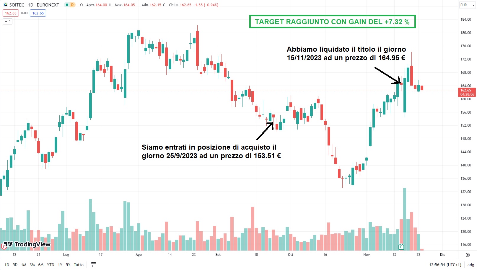 Soitec, simbolo: SOI, codice isin: FR0013227113, è un titolo che abbiamo acquistato il giorno 25 settembre 2023 sul mercato borsistico EURONEXT di Parigi, al prezzo di 153,51 € con la strategia “Azioni Internazionali” del Portafoglio Storico. Nonostante un ottobre nero per i listini azionari, il titolo è riuscito a non perdere molto grazie anche alla solidità dei propri bilanci ed alla crescita del fatturato. Poi, esattamente il 15 novembre 2023, il titolo è riuscito a toccare il nostro livello di target a 164,95 € al quale abbiamo venduto guadagnando un ottimo + 7,32%.