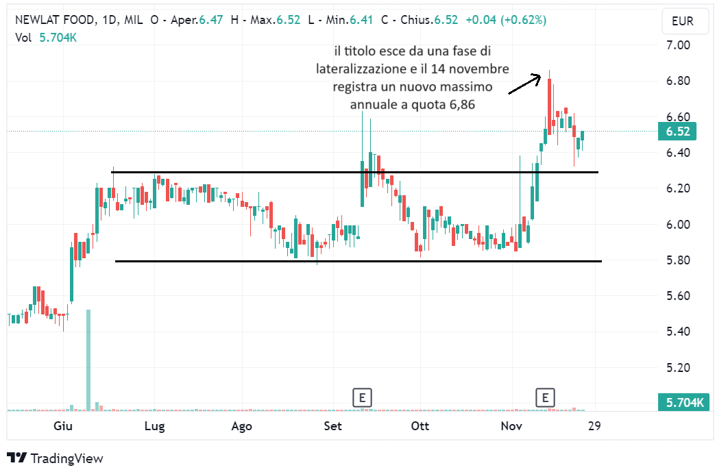 Fari puntati questo fine settimana su Newlat Food, titolo selezionato dalla lista del Lombard Stock Index e che recentemente ha toccato il suo massimo annuale per poi effettuare una correzione.