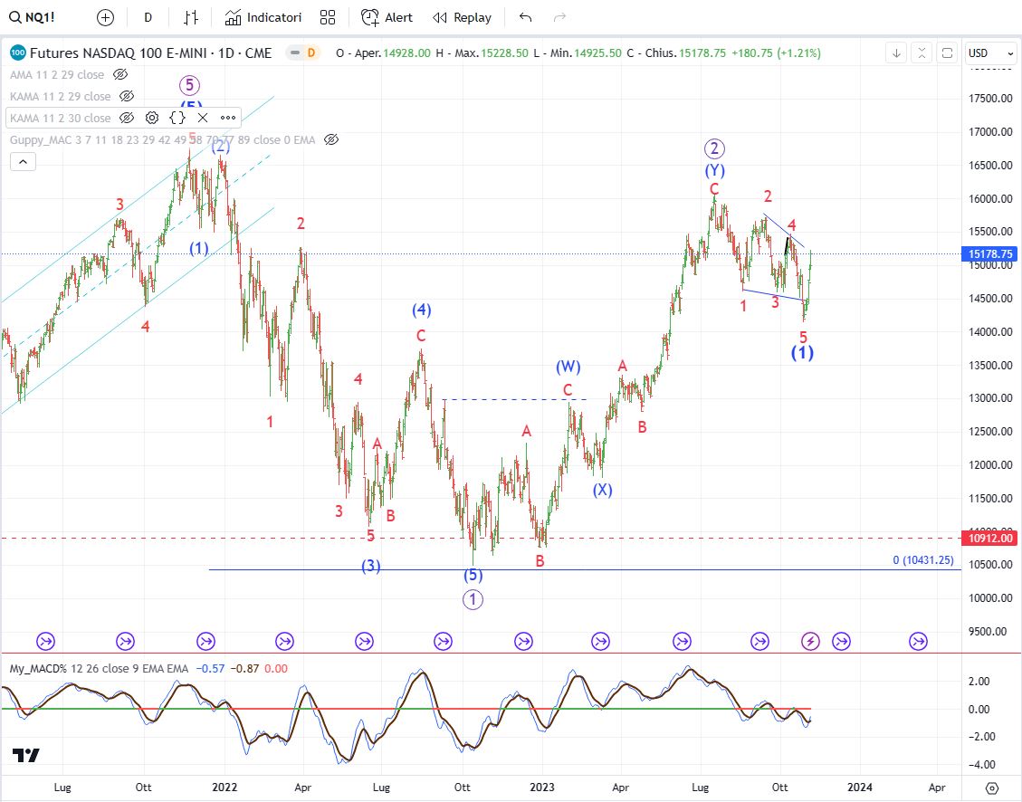 Leading Diagonal anche sul Nasdaq100. Anche in questo caso, che la correzione riporti i prezzi al livello del massimo di onda 4 è assolutamente probabile e nell’ordine delle cose e dopo vediamo che modello di onda correttiva si profilerà.