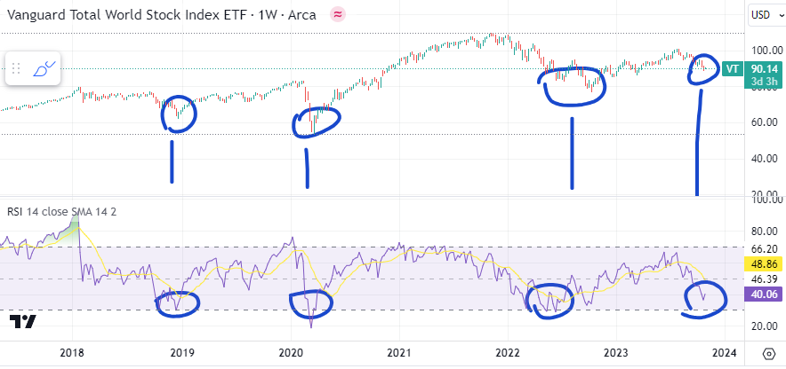 3. Se si vuole essere “guidati” negli acquisti basta prendere un qualsiasi indicatore ciclico (sono tutti uguali come lo stocastico o l’RSI) plottarlo sul settimanale e provare a comprare quando l’indicatore (nel caso qui di seguito illustrato) scende o tocca o sfiora quota 30. Grafico ed indicatore sono disponibili a tutti su www.tradingview.com GRATUITAMENTE