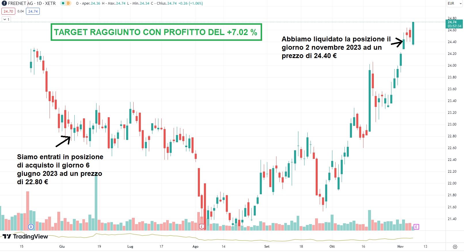 Abbiamo acquistato il titolo FREENET il giorno 06 giugno 2023 al prezzo di 22,80 € con la strategia Azioni Internazionali del Portafoglio Storico. Pochi giorni fa, esattamente il giorno 02 novembre 2023, il titolo è riuscito a toccare il nostro livello di target a 24,40 € al quale abbiamo venduto guadagnando l’ennesimo ottimo + 7,02%.
