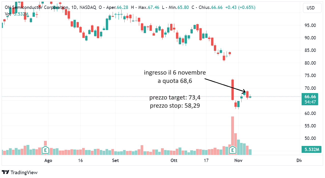 ON SEMICONDUCTOR CORPORATION (US6821891057 – NASDAQ: ON) – ON Semiconductor Corporation è un’azienda con sede a Phoenix (Arizona) attiva nel campo dei semiconduttori. Sul titolo siamo entrati il 6 novembre a quota 68,6 con un prezzo target di 73,4 ed un prezzo stop di 58,29.