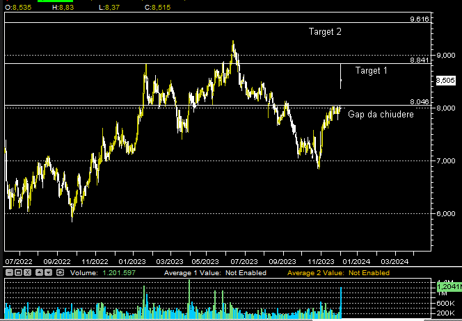 I target evidenziati sono agli 8.85€ e ai 9.62€, il primo toccato nella giornata di trading intraday ha retto e contenuto il movimento lasciando sperare per quel punto gap agli 8 € per la prossima settimana.