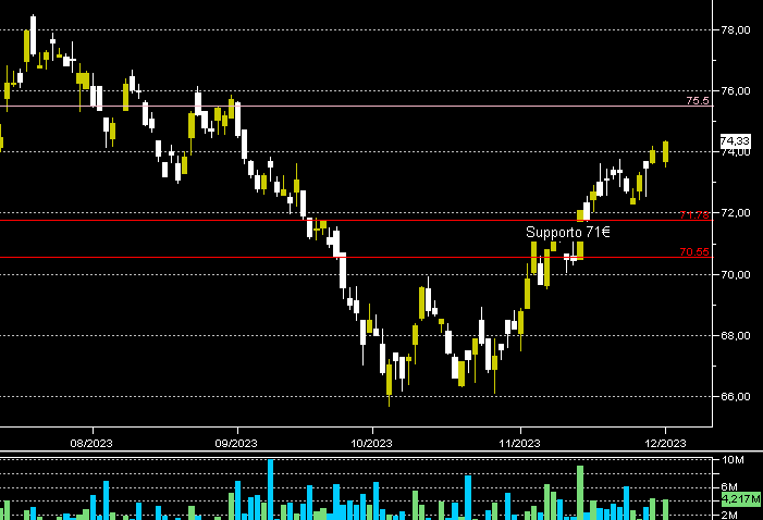 Come possibile vedere il movimento sta confermando il trend e la direzionalità intanto verso il primo target ai 75.5€ dopodichè sarà da valutare la forza a quel livello. Il titolo potrebbe ripiegare e dare nuova opportunità d'ingresso oppure potrebbe rompere il livello e a quel punto sarà da valutare in base al polso del singolo investitore se salire sul treno in corsa verso gli 85€ in un solo colpo o se farlo differenziando l'ingresso in più tranches.