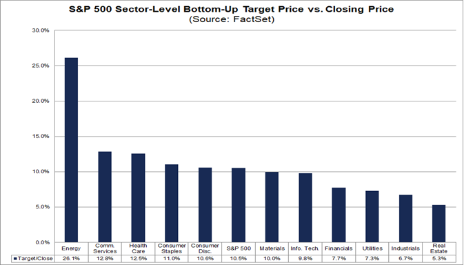 A livello settoriale, si prevede che il settore energetico registrerà il maggiore aumento di prezzo pari al 26,1%, poiché questo settore presenta la maggiore differenza al rialzo tra il prezzo target bottom-up e il prezzo di chiusura. D'altro canto, si prevede che il settore immobiliare registrerà l'aumento di prezzo più contenuto, pari al 5,3%, poiché questo settore presenta la più piccola differenza al rialzo tra il prezzo target bottom-up e il prezzo di chiusura.