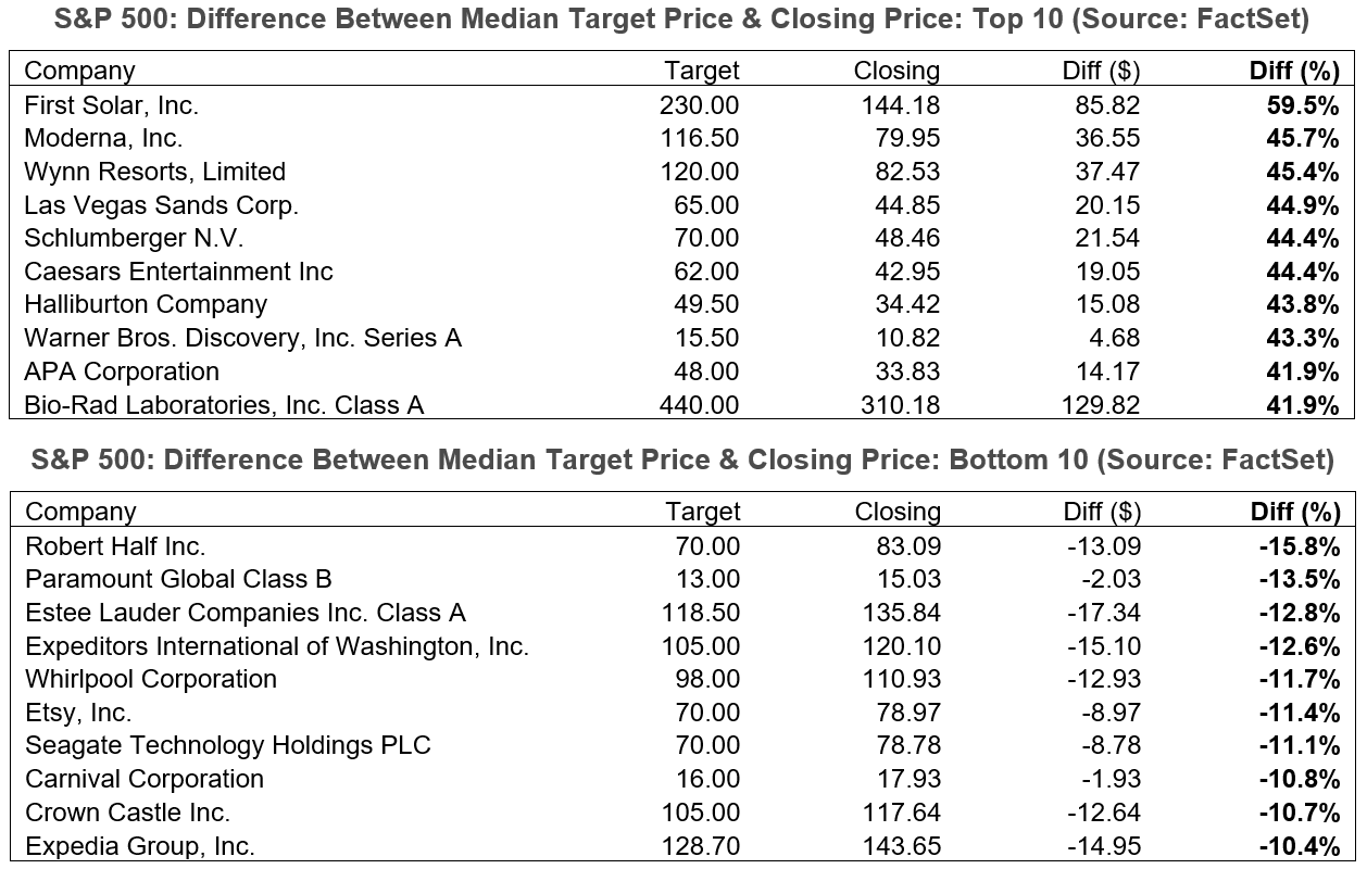 A livello aziendale, di seguito sono riportati i dieci titoli dell’S&P500 con le maggiori differenze al rialzo e al ribasso tra il prezzo target mediano e il prezzo di chiusura di giovedì 7 dicembre.