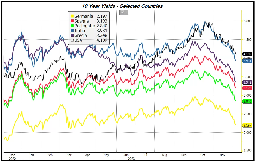 A cambiare sono forse state le retoriche di alcuni banchieri centrali per lo più europei, i quali, dopo aver detto a lungo che si attendevano rialzi dell'inflazione nei prossimi mesi e non erano convinti che la guerra fosse finita, recentemente hanno ammesso che i rialzi potrebbero essere finiti (vedi la Schnabel nei giorni scorsi). Ma anche in USA, un ‘falco’ come Waller ha dichiarato che il fatto che la curva scontasse tagli un paio di settimane fa (molti meno di ora) non era uno scenario da escludere. Il resto, forse, lo ha fatto un mercato scarico di bonds, dopo il rialzo dei rendimenti autunnale, e infine investitori timorosi di veder svanire i rendimenti appetibili che intendevano assicurarsi per il 2024.