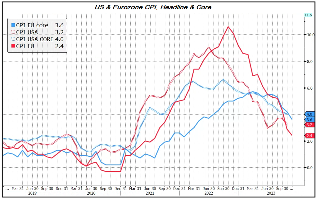 Vero, l'inflazione europea ha sorpreso al ribasso a novembre, in maniera significativa (da quella USA attendiamo ancora notizie già da domani, ma a ottobre era uscita sotto attese). Ma non è che ci siano stati stravolgimenti del trend: questo è solidamente al ribasso da un bel po' (vedi grafico sotto), e abbiamo spesso citato i fattori dietro al trend: il costo degli alloggi in calo e l’enorme debito degli USA, l'inflazione italiana al palo, e così via.