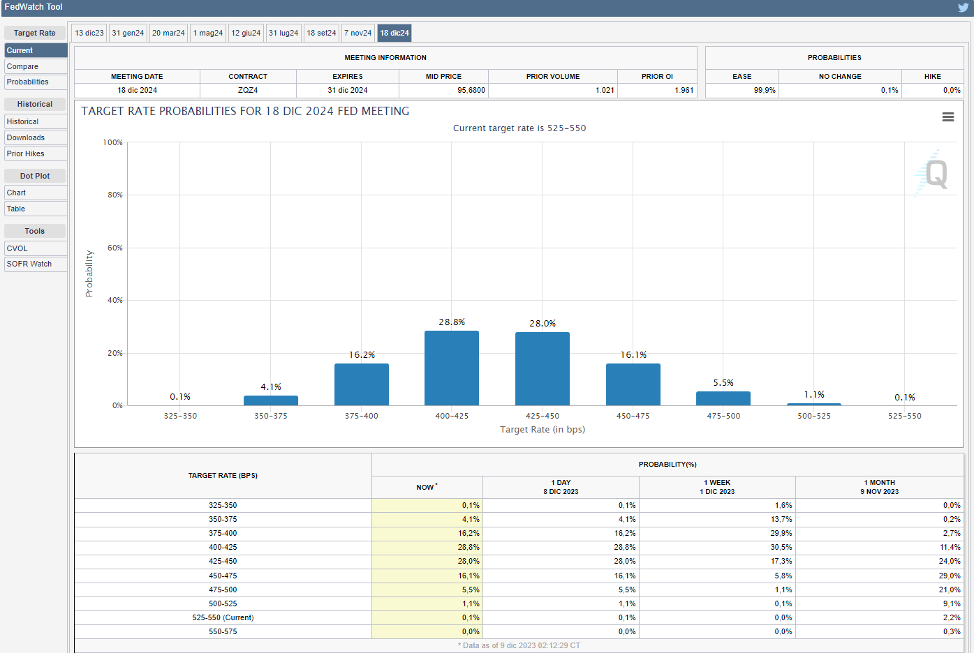 E passiamo ora alle aspettative dei mercati riguardo la politica sui tassi da parte della FED. Rispetto a due venerdì la pubblicazione dei buoni dati sul mercato del lavoro ha prodotto dei cambiamenti non tanto sulle probabilità riguardo alle scadenze corte ma su quelle più lunghe. Nello specifico, già a partire dalla riunione di mercoledì 13 dicembre, lo strumento FedWatch del CME Group mostra come i mercati scontino una probabilità del 97.1% che il tasso di riferimento della FED rimanga invariato al 5,25%-5,5%, rispetto alle previsioni di due venerdì fa c’è stato un lieve calo a causa dei buoni dati sul mercato del lavoro riportato venerdì scorso, ma la sostanza non cambia, nessuno si aspetta che l’Istituto muova i tassi (v.grafico):