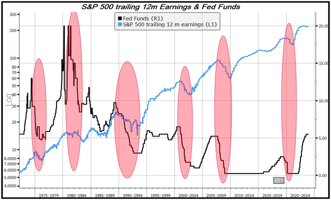 Vale la pena di osservare che la FED non ha mai intrapreso un ciclo di tagli dei tassi (4 o 5 tagli sono sufficienti per qualificare la serie come un ciclo espansivo) in assenza di una recessione o una significativa contrazione dei profitti aziendali, come si nota dal grafico seguente:
