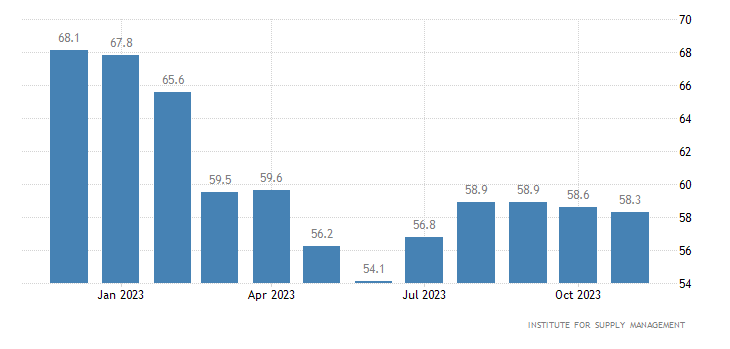 Per quanto riguarda i prezzi nel settore dei servizi, il dato rilasciato da ISM a novembre si attesta a quota 58,3 punti, segnando una contrazione rispetto ai 58,6 punti di ottobre.