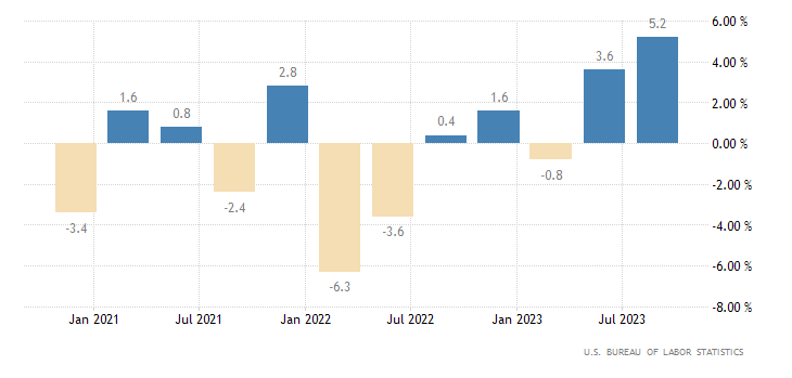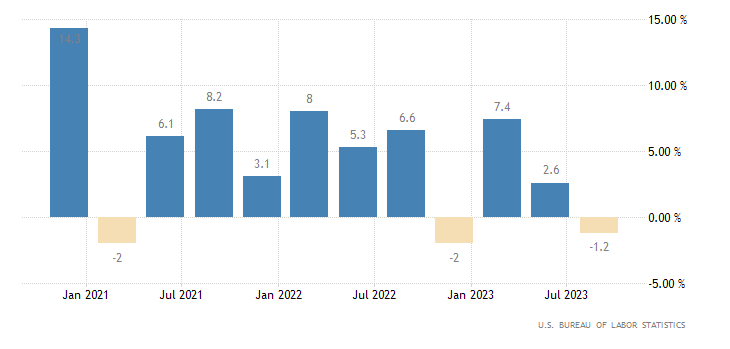 I costi unitari del lavoro nel settore non agricolo statunitense sono diminuiti dell’1,2% su base annua nel terzo trimestre del 2023, rispetto alla stima preliminare di un calo dello 0,8% e alle stime di mercato di un calo dello 0,9%. Si tratta del primo calo dall’ultimo trimestre del 2022, che riflette un aumento del 3,9% della retribuzione oraria (non rivista) e un aumento della produttività del 5,2% (rispetto al 4,7%).