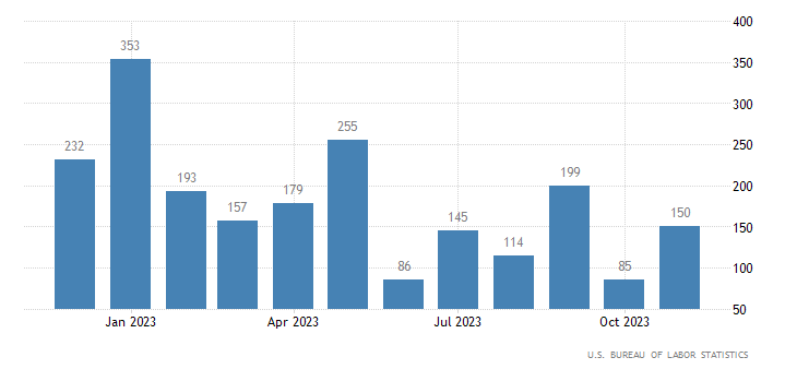 Nel settore non-agricolo privato a novembre sono stati creati 150 mila posti di lavoro, appena sotto al consensus di 153 mila ed in decisa crescita rispetto agli 85 mila posti di lavoro creati ad ottobre (rilevazione rivista da 99 mila). Il dato è rilasciato dall’U.S. Bureau of Labor Statistics.