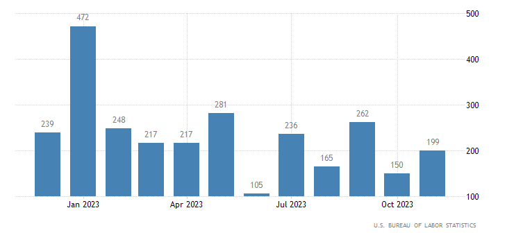 Nel settore non-agricolo a novembre sono stati creati 199 mila posti di lavoro, contro un consensus di 180 mila ed un dato di ottobre di 150 mila.