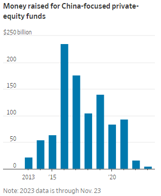 In un decennio, i fondi di private equity destinati alla Cina hanno raccolto mediamente quasi 100 miliardi di dollari l'anno, ma quest'anno hanno raccolto solo 4,35 miliardi di dollari, secondo i dati di Preqin.