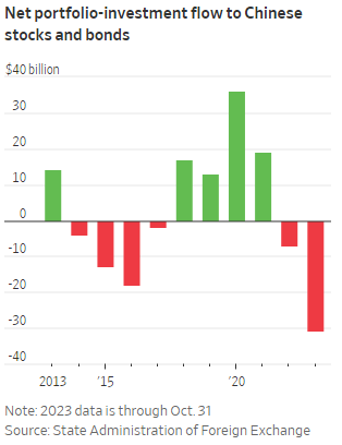 La politica di sicurezza nazionale imposta dal leader cinese Xi Jinping ha inoltre limitato l'accesso ai dati e scatenato indagini che coinvolgono aziende straniere. In questo contesto, i dati ufficiali cinesi indicano un deflusso netto di oltre 31 miliardi di dollari da azioni e obbligazioni cinesi fino ad ottobre di quest'anno, il più grande dal 2001, anno dell'adesione della Cina all'Organizzazione mondiale del commercio.