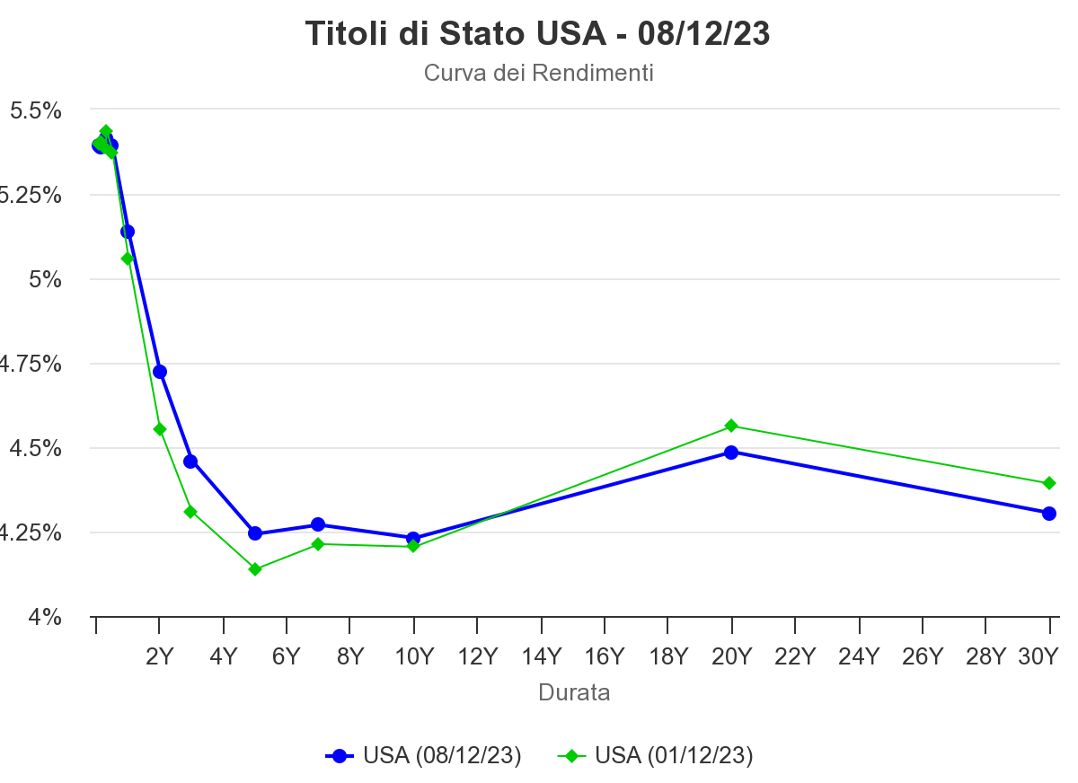 Anche se la situazione si è attenuata venerdì scorso con l’uscita di buoni dati sul mercato del lavoro che fanno propendere nuovamente per un’economia in ‘soft landing’, nel grafico si nota bene l'accelerazione tra fine novembre e inizio dicembre, con approdo su livelli inimmaginabili appena 6 settimane fa, quando dominava la narrativa del "higher for longer" e la retorica delle banche centrali induceva le curve a scontare significative probabilità di ulteriori aumenti dei tassi.