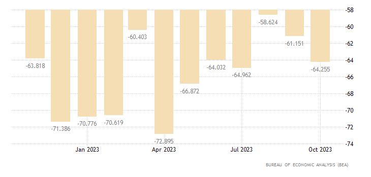 La bilancia commerciale che misura la differenza in valore tra beni e servizi importati ed esportati ad ottobre si attesta a quota -64,30 miliardi di dollari, contro un consensus -64,20 miliardi ed un dato di settembre di -61,20 miliardi (rivisto da -61,50 miliardi). Il dato è rilasciato dall’U.S. Bureau of Economic Analysis.