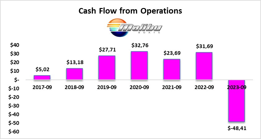 A livello trimestrale, il Cash Flow Operativo di MALIBU BOATS registra un inconsueto valore negativo.