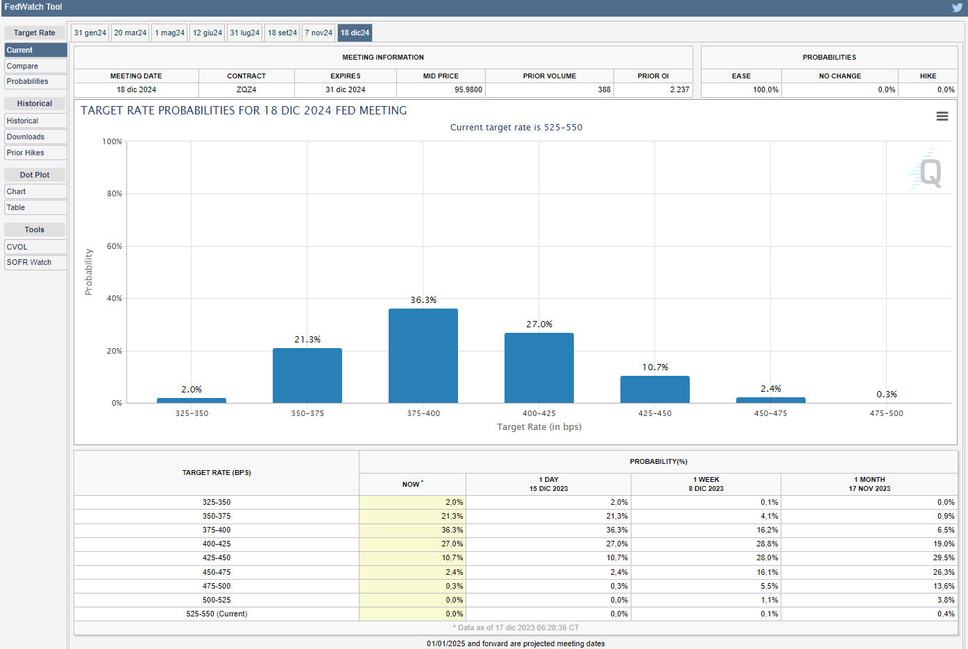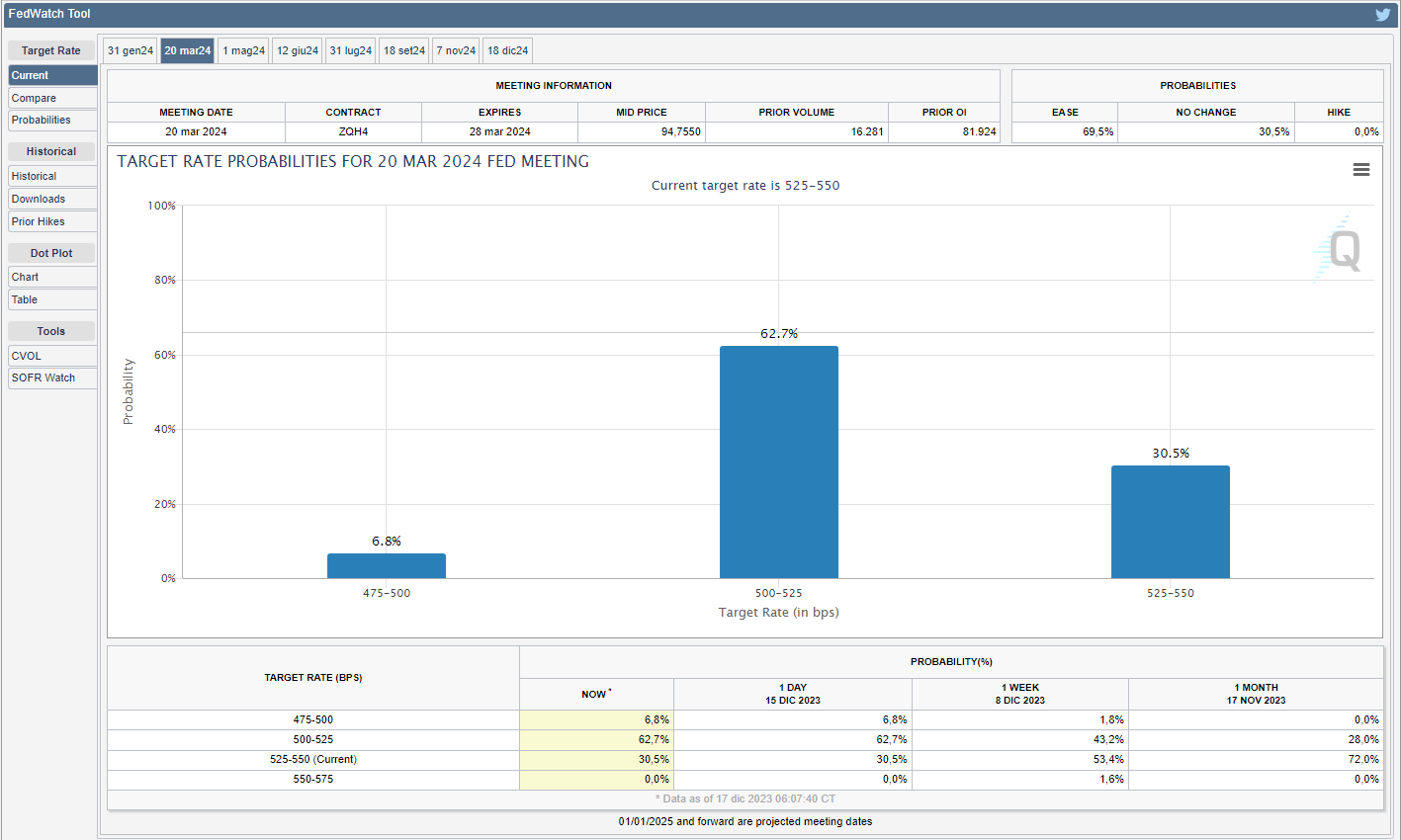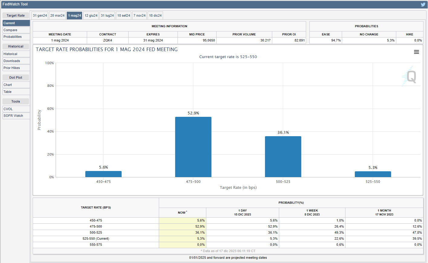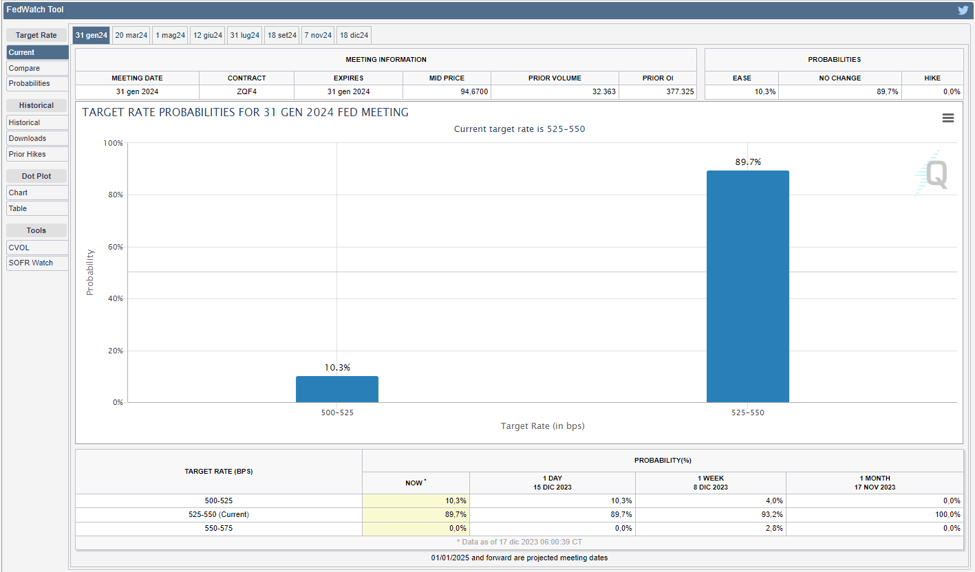 Lo strumento FedWatch del CME Group mostra come i mercati, per la prima riunione del 2024 in programma il 31 gennaio, iniziano a prezzare una modesta probabilità di uno sconto di 25 bps (10,3%) contro il 4% di due venerdì fa (v. grafico):