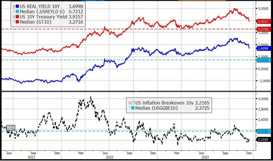 Se il Treasury 10 anni è ai minimi da luglio, la Spagna è ai minimi da gennaio, il BTP e il Bund da dicembre 2022, Il Portogallo da settembre 2022, la Grecia da agosto 2022. Le successive riunioni delle Banche centrali di Europa ed Inghilterra non hanno seguito Powell & C. su questo terreno, ma la crescita in Eurozone e UK è troppo fiacca affinché i loro mugugni possano frenare il movimento causato dalla principale banca centrale del mondo. Vale la pena osservare che il cambio di posizione della FED in direzione accomodante è stato interamente assorbito dai tassi reali, visto che i “breakeven inflation” navigavano sui minimi di periodo e una posizione più accomodante gli offre supporto (v. grafico):