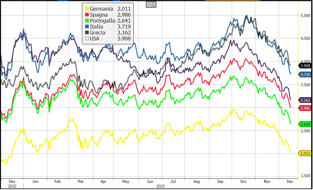 Settimana spettacolare per l’accoppiata obbligazionario e equity, grazie alle dichiarazioni mooooolto concilianti del presidente della FED, Jerome Powell, a margine della riunione del FOMC di mercoledì scorso, nelle quali fa capire perfettamente che un “pivot” di rialzi è stato raggiunto e, addirittura, apre a possibili tagli nel 2024 sempre a seconda dei dati macro che usciranno. Pertanto questa settimana la palma del migliore va al mercato obbligazionario con i rendimenti crollati nelle giornate di mercoledì e giovedì a supporto dei mercati azionari e in particolare all’indice Russell 2000, quello delle società a medio-basse capitalizzazioni. Entreremo nello specifico delle percentuali più avanti, nel frattempo propongo questo grafico di insieme di bond a 10 anni tra europei ed USA dal dicembre 2022, impressionante vedere dove erano i rendimenti appena due mesi fa e dove sono oggi: