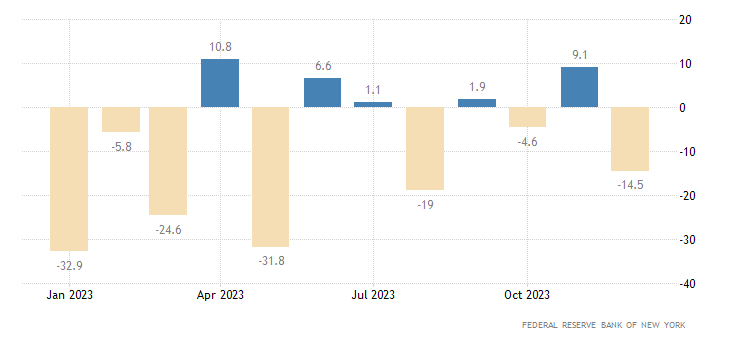 L’indice manifatturiero del New York Empire State a dicembre è pari a -14,50 punti, dato decisamente inferiore al consensus di 2,00 punti ed in forte calo rispetto ai 9,10 punti di novembre. Il dato è rilasciato dalla Federal Reserve Bank di New York.