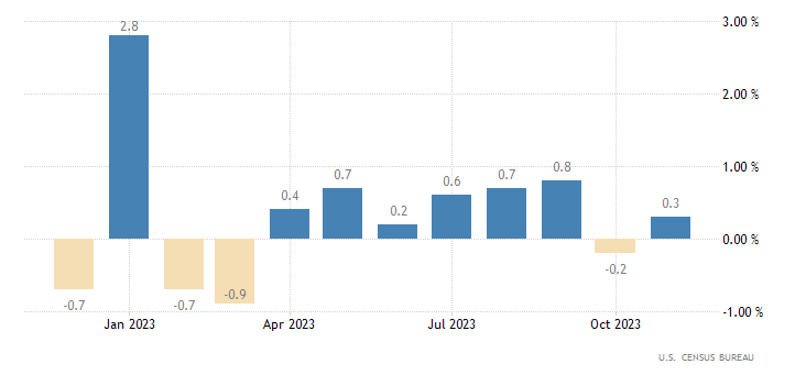 Le vendite al dettaglio a livello mensile a novembre segnano un +0,3%, in direzione opposta rispetto ad un consensus che indicava un calo dello 0,1% e dopo il -0,2% di ottobre (rivisto da -0,1%). Il dato è rilasciato dall’U.S. Census Bureau.