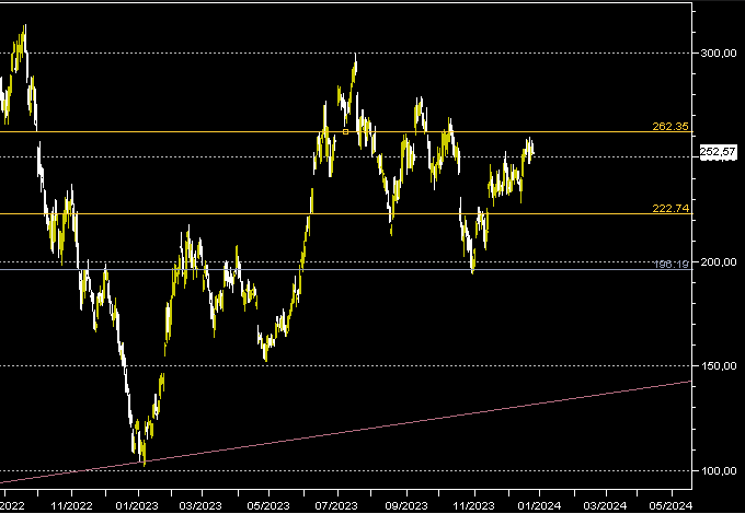 Uno switch di medio lungo periodo è fissato ai 260$ oltre il quale l'immissione di ordini long ha più probabilità di regalare soddisfazioni rispetto ad un ordine in controtendenza, e quindi in shot selling.