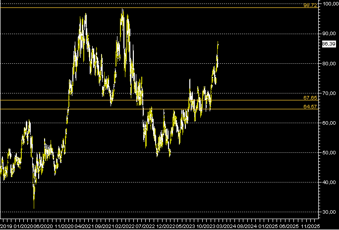 Il target dell'attuale movimento possiamo fissarlo ai 98$ e ciò che potrebbe impedire o determinare quest'ultimo strappo non può che essere la direzionalità che gl'indici prenderanno sin dai primissimi giorni di gennaio 2024.