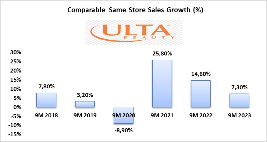 Nel corso dei primi nove mesi del 2023, ULTA BEAUTY ha nuovamente battuto il record storico di fatturato raggiungendo i $ 7,65 mld (+9,6%).