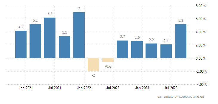 Il secondo dato preliminare del PIL relativo al terzo trimestre 2023 segna un +5,2%, dopo che il precedente dato preliminare si era attestato a +4,9% ed il dato relativo al secondo trimestre del PIL al +2,1%. Il dato è rilasciato dall’U.S. Bureau of Economic Analysis.