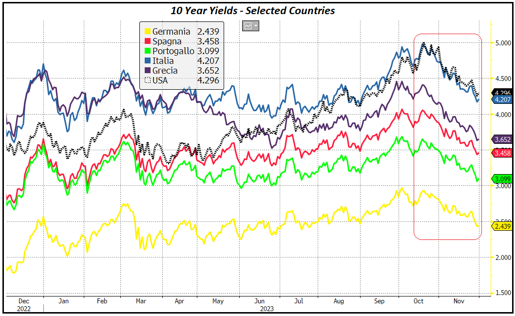 E che dire dei rendimenti, che dai livelli della seconda metà di ottobre sono crollati ai minimi da mesi nel volgere di qualche settimana? Alimentato da dati di inflazione sempre più bassi i bonds hanno accelerato il movimento di rialzo negli ultimi giorni. Le quotazioni dei Treasury nel mese di novembre hanno chiuso a segno di record registrando il miglior mese come total return dal 1985. Recupero amplificato nella giornata di venerdì scorso dopo il discorso di Powell ad Atlanta.
