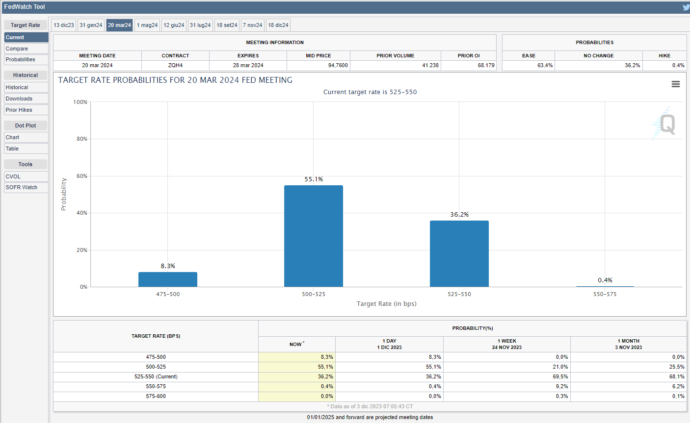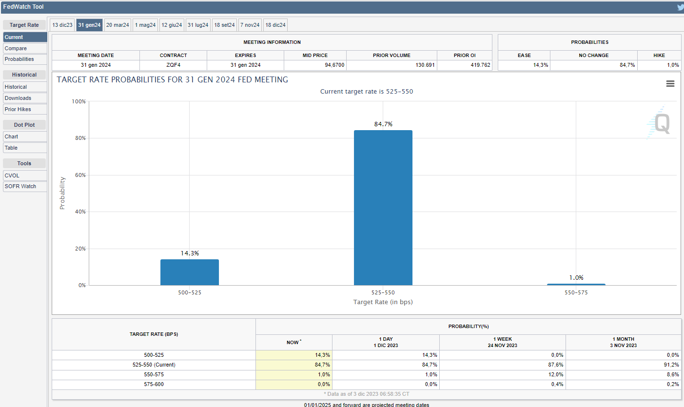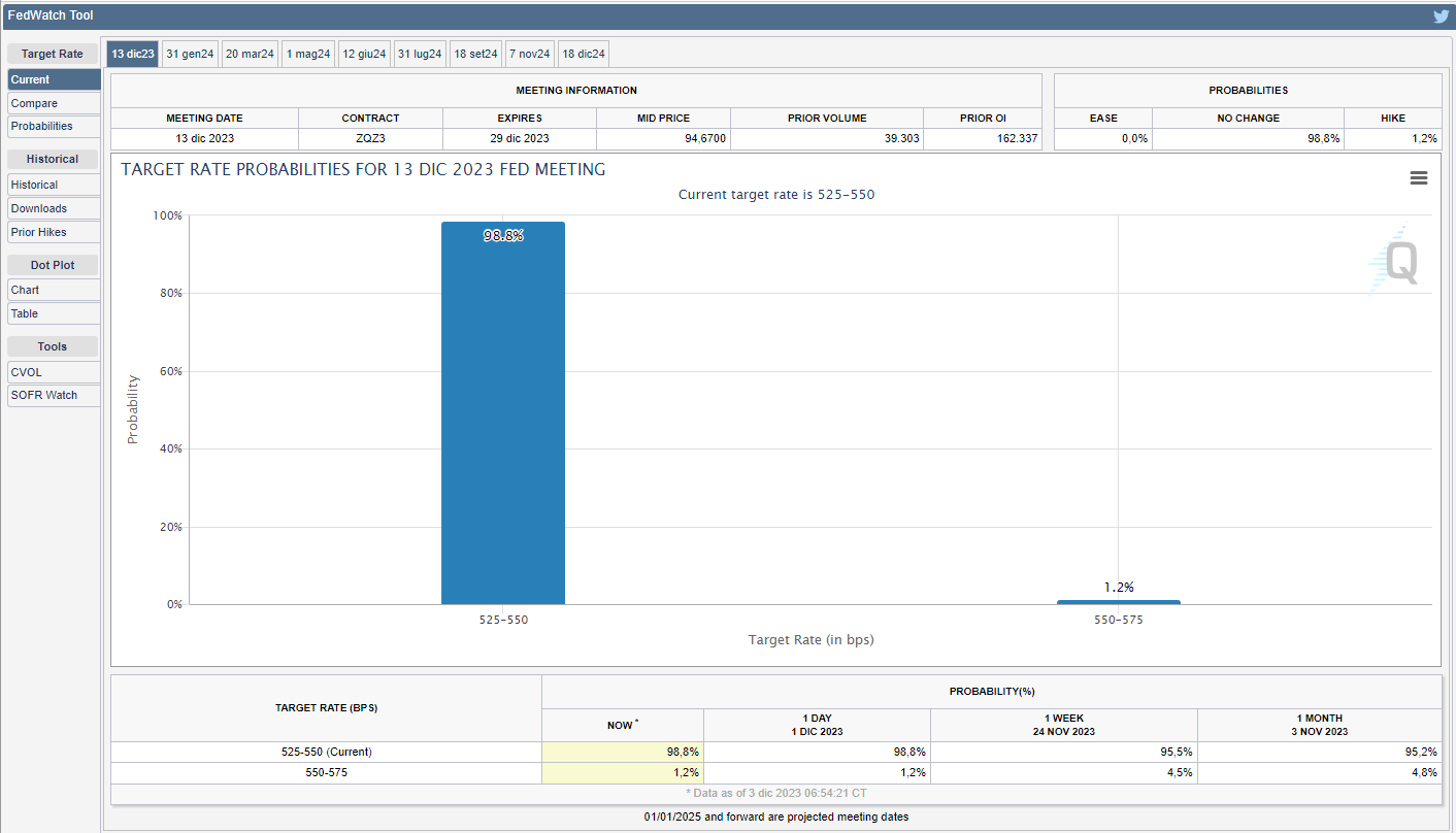 Da quando, poco più di un mese fa, il mantra che impazzava era "higher for longer", sembra passato un secolo. Dopo il discorso di Powell di venerdì scorso, andando ad aggiornare quanto scontato dalle curve monetarie, scopriamo che negli USA gli investitori si aspettano tra i 125 e 150 punti base di tagli dei tassi da parte della FED per la fine del 2024. Vediamo nello specifico lo strumento FedWatch del CME Group che mostra come i mercati scontino una probabilità del 98.8% che il tasso di riferimento della FED rimanga invariato al 5,25%-5,5% nella prossima riunione del 13 dicembre mantenendo una piccola riserva dell’1,2% dovuta alla pubblicazione degli importanti dati sul mercato del lavoro di venerdì. (v. grafico):