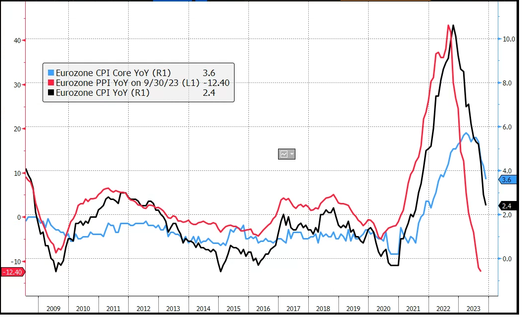 Anche nell’Eurozone i dati inflattivi sono usciti con delle sorprese al ribasso rispetto al consenso degli economisti formatosi negli ultimi giorni, con la Spagna che ha riportato un 3,2% in calo rispetto al + 3,4% atteso, la Germania che ha riportato un 3,2% in calo rispetto al 3,5% atteso, la Francia che ha riportato un 3,8% rispetto al 4,1% atteso, l’Italia (manco a parlarne) che ha riportato uno 0,7% rispetto al 1,4% atteso ed infine l’aggregato ‘core’ Eurozone che ha riportato un 3,6% rispetto al 3,9% atteso. Questo vuol dire che il maggior contributo alla sorpresa negativa non viene dalle componenti volatili, ma dall'inflazione ‘core’. Uno sguardo al grafico mostra chiaramente la situazione, con la headline quasi tornata al target e la ‘core’ ancora un po' indietro con i prezzi alla produzione che mantengono pressioni disinflattive su quelli al consumo.