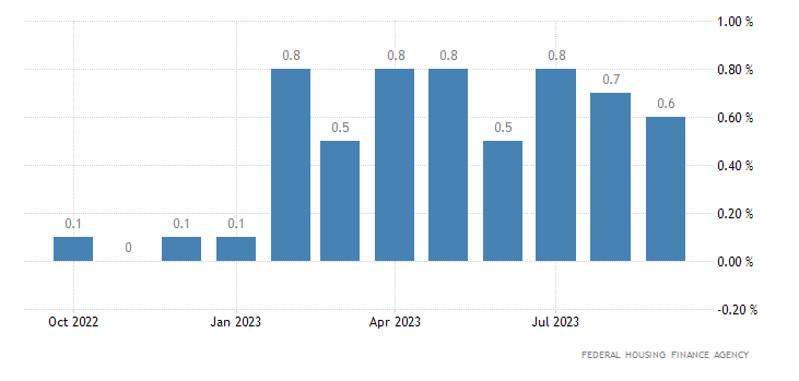 L’indice di prezzo delle case a livello mensile a settembre cresce dello 0,6%. In particolare, il dato è passato dai 412,2 punti di agosto (rivisti da 411,8 punti) a 414,8 punti di settembre. Il dato è rilasciato dalla Federal Housing Finance Agency.