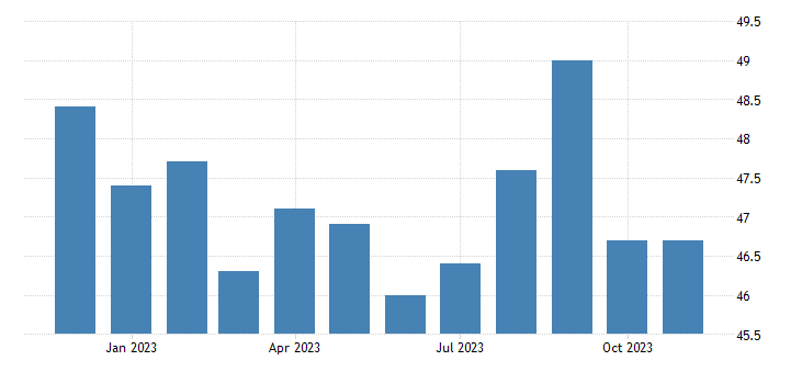 Il PMI manifatturiero rilasciato da ISM a novembre si attesta a quota 46,7 punti, come ad ottobre e restando sotto al consensus fissato a 47,6 punti.