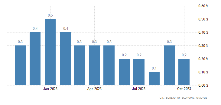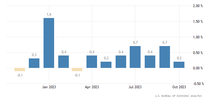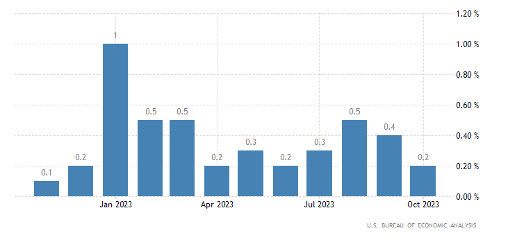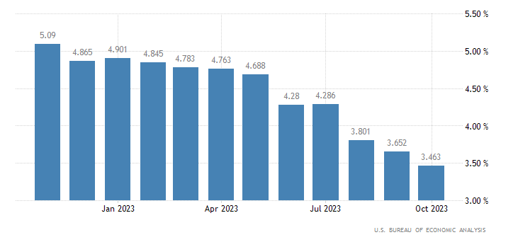 Su base annua, la crescita di ottobre è del 3,5%, come indicato dal consensus e con un rallentamento rispetto al +3,7% di settembre. Il dato è rilasciato dall’U.S. Bureau of Economic Analysis.
