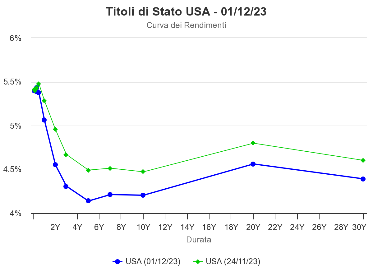 Le sfumature delle dichiarazioni del Presidente della FED, Powell, allo Spelman College di Atlanta, hanno confermato che i rialzi dei tassi sono terminati. Mentre in precedenza aveva descritto i tassi come "non troppo stretti" in ottobre, ora afferma che i tassi sono "ben in territorio restrittivo". Anche se queste descrizioni potrebbero non essere intrinsecamente incoerenti, gli investitori ne hanno tratto un chiaro messaggio non detto. Da qui abbiamo visto le quotazioni del dollaro perdere per la terza settimana consecutiva, gli indici azionari continuare la salita per la quinta settimana consecutiva, le quotazioni dell’Oro salire per la terza settimana consecutiva fino a raggiungere un massimo storico ed il crollo dei rendimenti obbligazionari, con i Treasury in testa su tutte le scadenze.